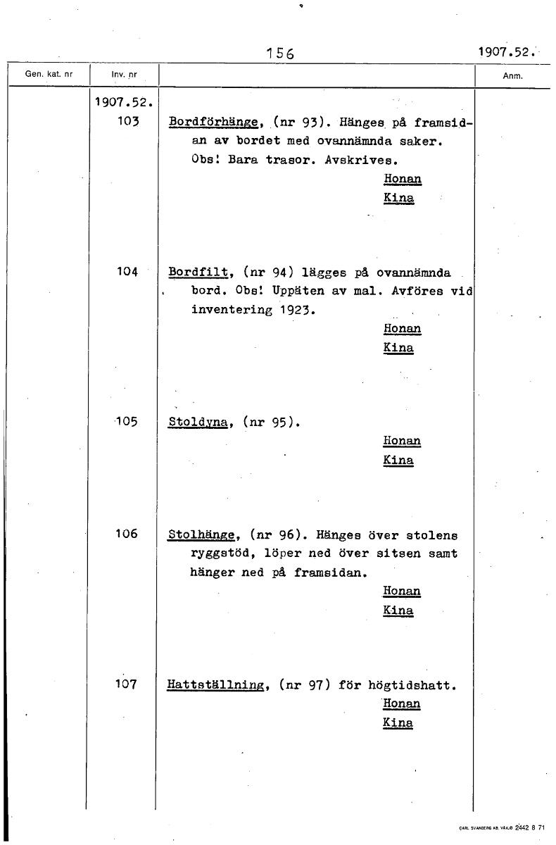 156 1907.52. 1907.52. 103 Bordförhänse,.(nr 93), Hänges, på framsid- an av bordet med ovannämnda saker. Obs: Bara trasor. Avskrivas. Honan Kina 104 Bordfilt, (nr 94) lägges på ovannämnda bord. Obs! Up...