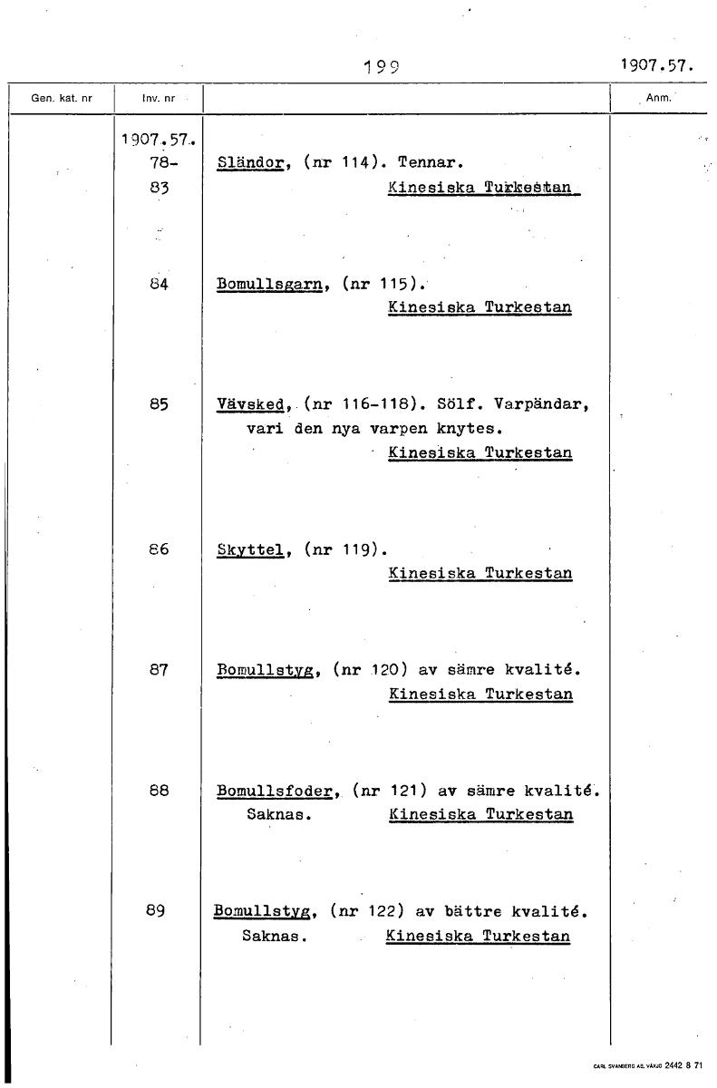 199 1907.57. 1907.57. 78- Sländor, (nr 114). Tennar. 83 Kinesiska Tukketåtan 84 Bomullsgarn, (nr 115). Kinesiska Turkestan 85 Vävsked,. (nr 116-118). Sölf. Varpändar, vari den nya varpen knytes. • Kin...