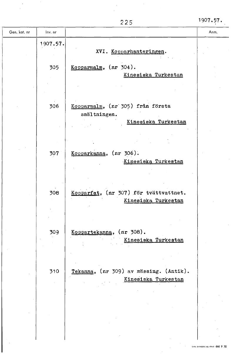 225 1907.57. 1907.57. XVI. 112212arlaänItrimem. 305 Kopparmalm, (nr 304). Kinesiska Turkestan 306 Kopparmalm, (nr' 305) från första smältningen. Kinesiska Turkestan 307 Kopparkanna, (nr 306). Kinesisk...