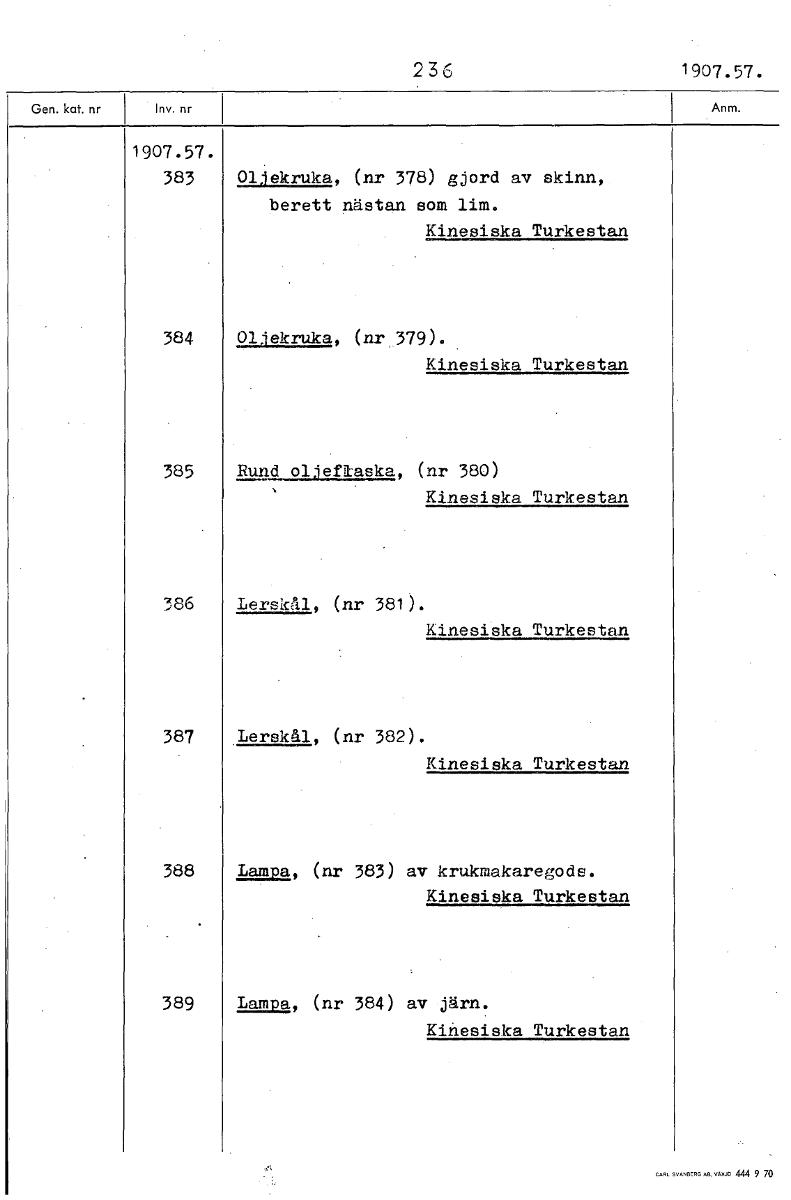 236 1907.57. 1907.57. 383 Oljekruka, (nr 378) gjord av skinn, berett nästan som lim. Kinesiska Turkestan 384 Oljekruka, (nr 379). Kinesiska Turkestan 385 Rund oljeflaska, (nr 380) Kinesiska Turkestan 386 Lerskål, (nr 381). Kinesiska Turkestan 387 Lerskål, (nr 382). Kinesiska Turkestan 388 Lampa, (nr 383) av krukmakaregods. Kinesiska Turkestan 389 Lampa, (nr 384) av järn. Kinesiska Turkestan [ocr]