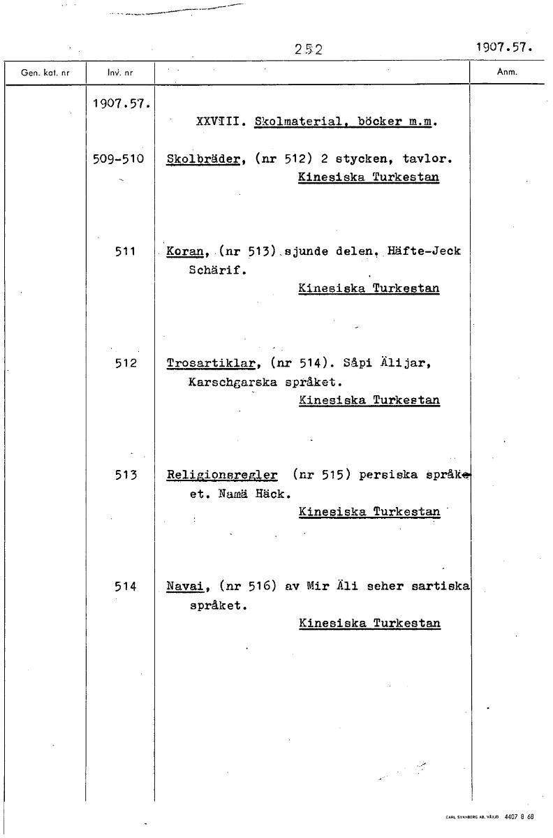 • 2.52 1907.57. 1907.57. XXVIII. Skolmaterial, böcker m.m. 509-510 Skolbräder, (nr 512) 2 stycken, tavlor. Kinesiska Turkestan 511 Koran, (nr 513) sjunde delen. Häfte-Jeck Schärif. Kinesiska Turkestan 5... Visa hela