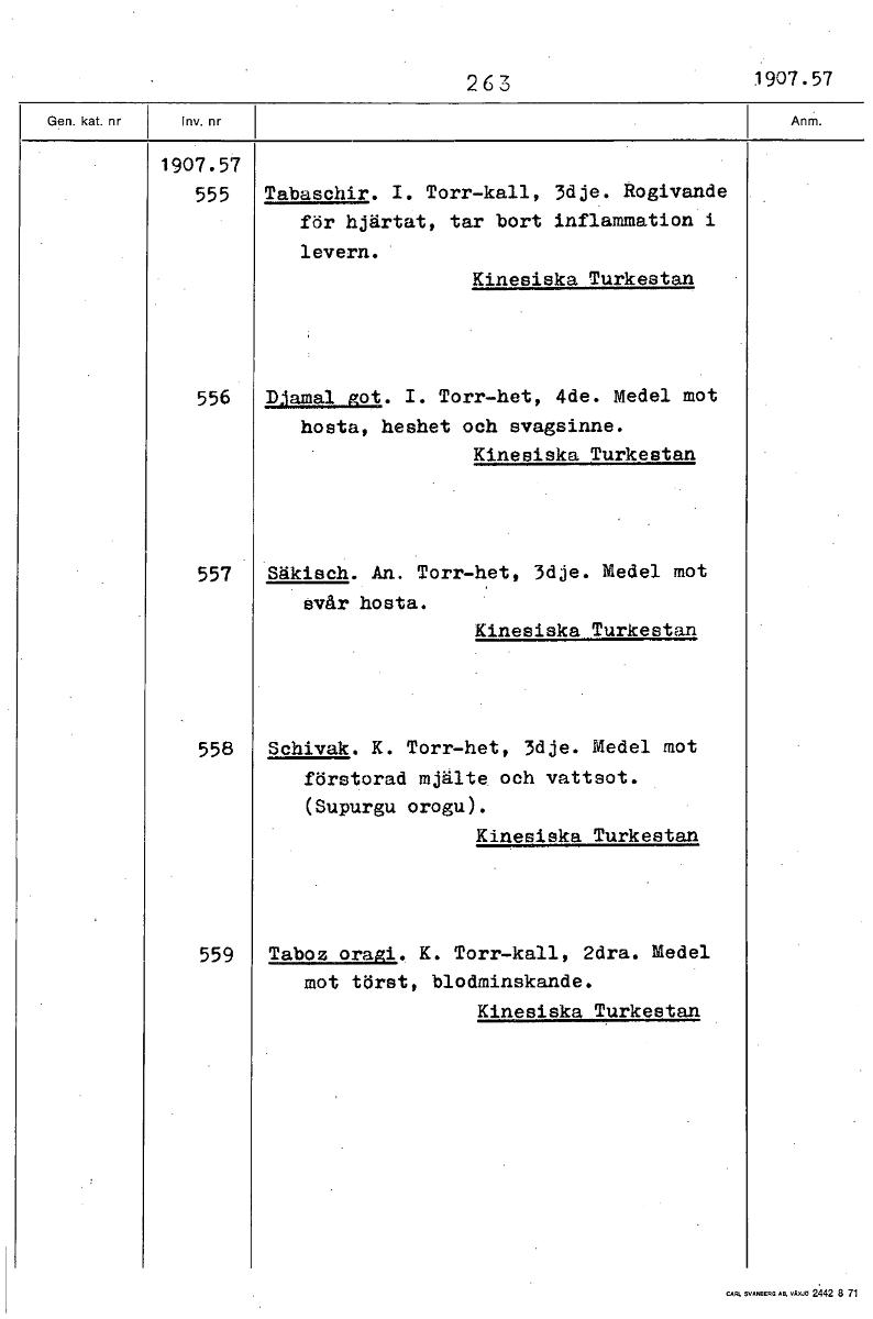 263 1907.57 1907.57 555 Tabaschir. I. Torr-kall, 3dje. Rogivande för hjärtat, tar bort inflammation i levern. Kinesiska Turkestan 556 Diamal got. I. Torr-het, 4de. Medel mot hosta, heshet och svagsinn...
