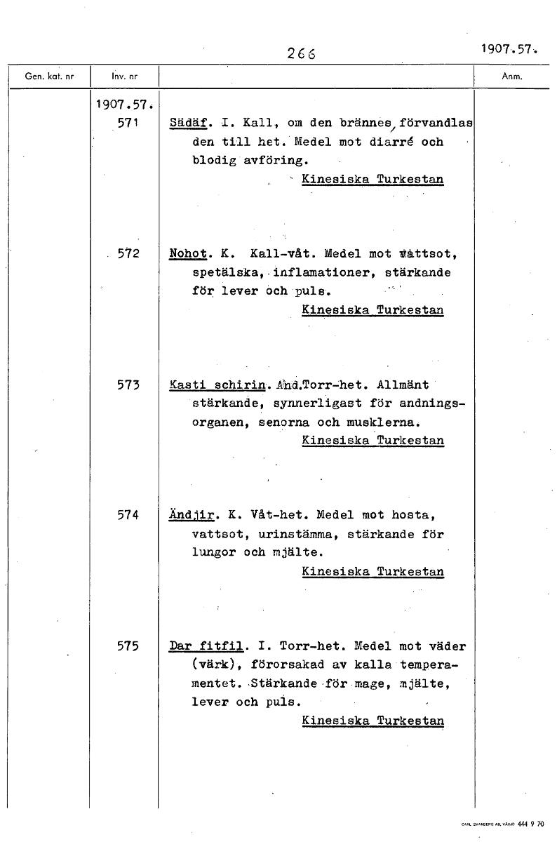 266 1907.57. 1907.57. 571 Sädäf. I. Kall, om den brännes/förvandlas den till het. Medel mot diarré och blodig avföring. Kinesiska Turkestan 572 Nohot. K. Kall-våt. Medel mot nattsot, spetälska,•inflam...