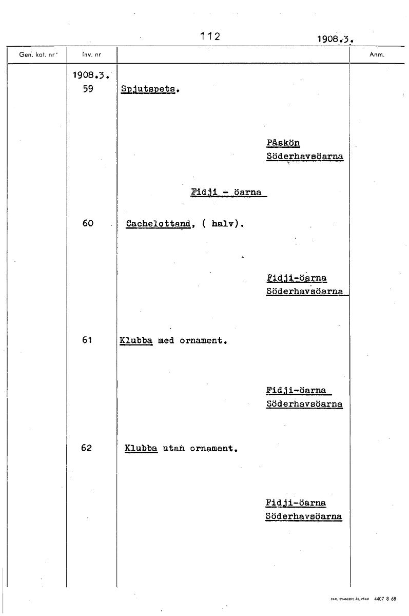 • 112 1908.3. 59 Spjutspets. Påskön Söderhavsöarna Pidji - öarna 60 Cachelottand, ( halv). Pidji-öarna Söderhavsöarna 61 Klubba med ornament. Pidji-öarna Söderhavsöarna 62 Klubba utan ornament. Piciji-ö... Visa hela