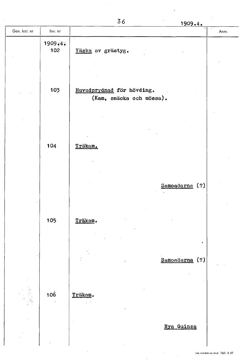 • 36 1909.4, 1909:4.• 102 Väska av grästyg. 103 Huvudprydnad för hövding, (Kam, snäcka och mössa). 104 Träkam. Samoaöarna (?) 105 Träkam. Samoaöarna (?) 106 Träkam. än_Guinea [ocr]