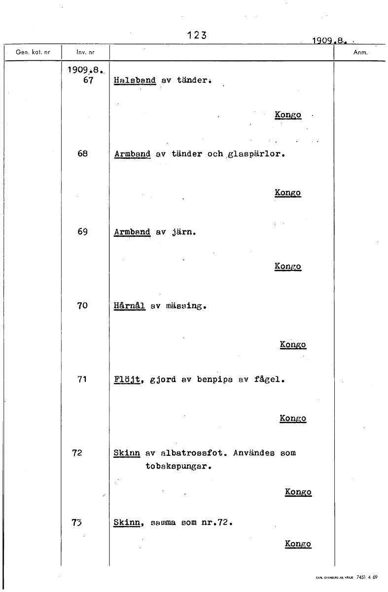 • 123 1909.8. . 1909.8. 67 Halsband av tänder: Rongo • 68 Armband av tänder och, glaspärlor. Kongo 69 Armband av järn. Kongo 70 Hårnål av mässing. Kongo 71 21/1, gjord av benpipa av fågel.. Kongo 72 Ski... Visa hela