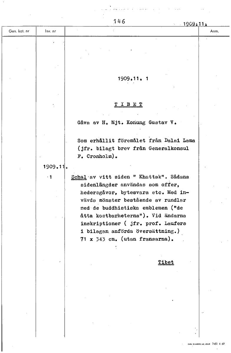 146 1909111i1 1909 411 1 TIBET Gåva av H. Mjt. Konung Gustav V. Som erhållit föremålet från Dalai Lama (jfr. bilagt brev från Generalkonsul P. Cronholm). 1909.11 '1 Schal'av vitt siden " Khattak". Såd...Visa hela