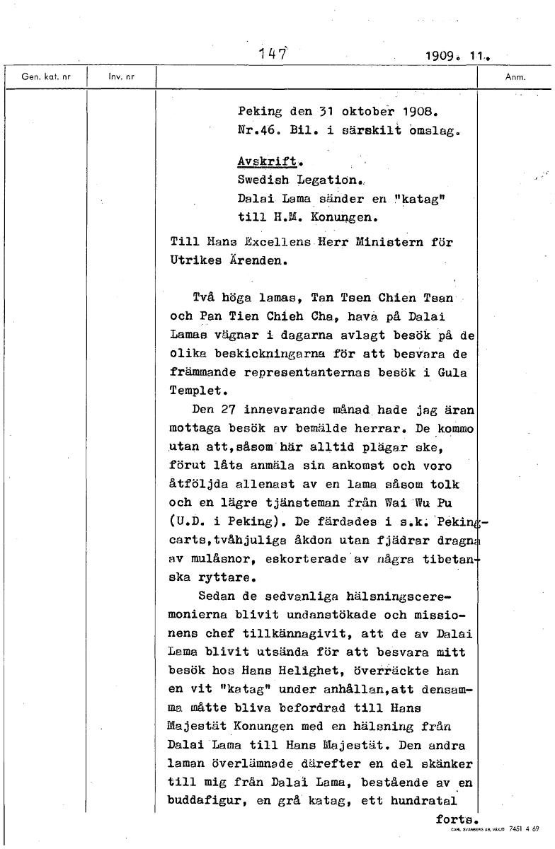 1 4 rt 1909. 11. Peking den 31 oktober 1908. Nr.46. Bilo i särskilt omslag. Avskrift. Swedish Legation. Dalai Lama sänder en "katag" till H.M. Konungen. Till Hans Excellens Herr Ministern för Utrikes ...