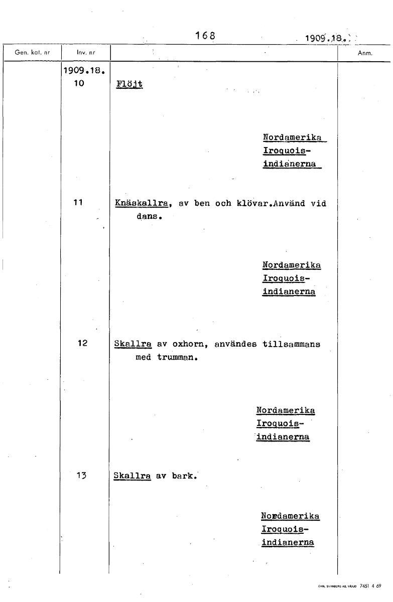 • 168 . 1905.18. 1909 18. 10 not Nordamerika Irocluois- indiånerna 11 Knäskallra, av ben öch klöVar.Använd vid dans. Nordamerika A292912.- indianerna 12 Skallra av oxhorn, användes tillsammans med trumm... Visa hela