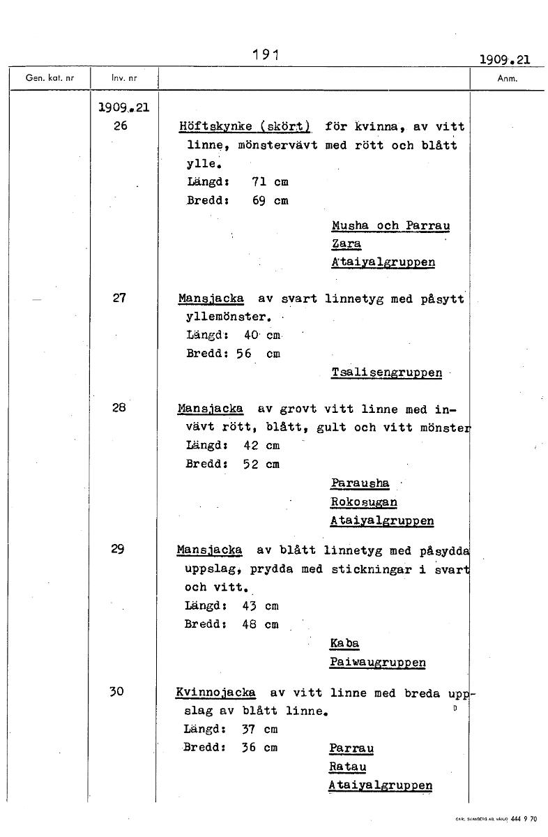 191 1909.21 1909,4,21 26 Höftskynke (sk för kvinna, av vitt linne, mönstervävt med rött och blått ylle. Längd: 71 cm Bredd: 69 cm Musha och Parrau Zara Ataiyalgruppen 27 Mansjacka av svart linnetyg me...