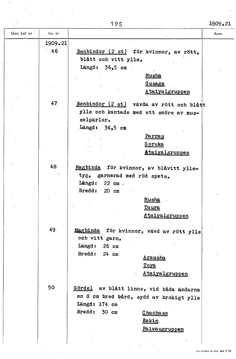 195 1909 21 19097.21 4,6- Benbindor (2 st) för kvinnor, av rött, blått och vitt ylle. Längd: 36,5 cm Musha GUSEIge A taiya lgruppen 47 Benbindor (2 st) vävda av rött och blått ylle och kantade med ett snöre av mus- selpärlor. Längd: 34,5 cm Parrau Soruka Ataiyalgruppen 48 Magbinda för kvinnor, av blåvitt ylle- tyg, garnerad med röd spets. Längd: 22 cm Bredd: 20 cm Musha Taura 49 ~binda för kvinnor, vävd av rött ylle och vitt garn. Längd: 26 cm Bredd: 24 cm Arausha Toya Ataiyaloruppen 50 Gördel av blått linne, vid båda ändarna en 8 cm bred bård, sydd av brokigt ylle Längd: 174 cm Bredd: 30 cm Chachaso Kakin Paiwaugruppen [ocr]
