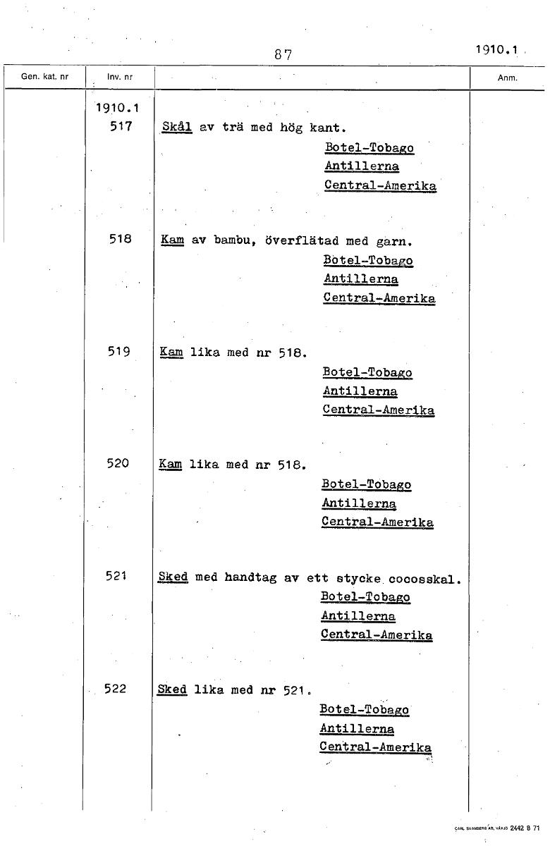 • 87 1910.1 1910.1 517 Skål av trä med hög kant. Botel-Tobago Antillerna Central-Amerika 518 Kam av bambu, överflätad med garn. Botel-Tobago Antillerna Central-Amerika 519 Kam lika med nr 518. Botel-Tob... Visa hela