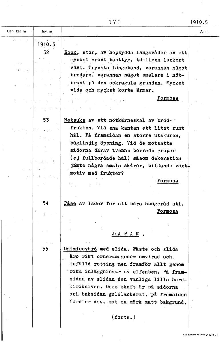 1 71 1910.5 1910.5 52 Rock, stor, av hopsydda längsnåder av ett mycket grovt basttyg, tämligen luckert vävt. Tryckta längsband, varannan något bredare, varannan något smalare i nöt- brunt på den ockragula grunden. Mycket vida och mycket korta ärmar. Formosa 53 Netsuke av ett nötkärneskal av bröd- frukten. Vid ena kanten ett litet runt hål. På framsidan en större utskuren, båglinjig öppning. Vid de motsatta sidorna därav tvenne borrade gropar (ej fullbordade hål) såsom dekoration jämte några smala skåror, bildande växt motiv med frukter? Formosa 54 Påse av läder för att bära husgeråd uti. Formosa P A N . 55 Daimiosvärd med slida. Fäste och slida äro rikt ornerade genom omvirad och infälld rotting men framför allt genom rika inläggningar av elfenben. På fram- sidan av slidan den vanliga lilla hara- kirikniven. Dess skaft är på sidorna och baksidan guldlackerat, på framsidan företer den, mot en mörk matt bakgrund, (forts.) [ocr]