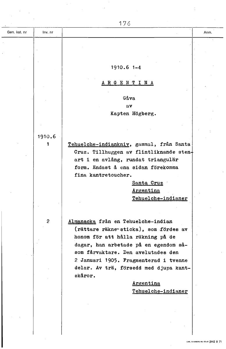 176 1910.6 1-4 ARGENTINA Gåva av Kapten Högberg. 1910.6 1 Tehuelche-indiankniv, gammal, från Santa Cruz. Tillhuggen av flintliknande sten art i en avlång, rundat triangulär form. Endast å ena sidan förekomma fina kantretoucher. Santa Cruz Argentina Tehuelche-indianer 2 Almanacka från en Tehuelche-indian (rättare räkne-sticka), som fördes av honom för att hålla räkning på de dagar, han arbetade på en egendom så- som fårvaktare. Den avslutades den 2 Januari 1905. Pragmenterad i tvenne delar. Av trä, försedd med djupa kant- skåror. Argentina Tehuelche-indianer [ocr]