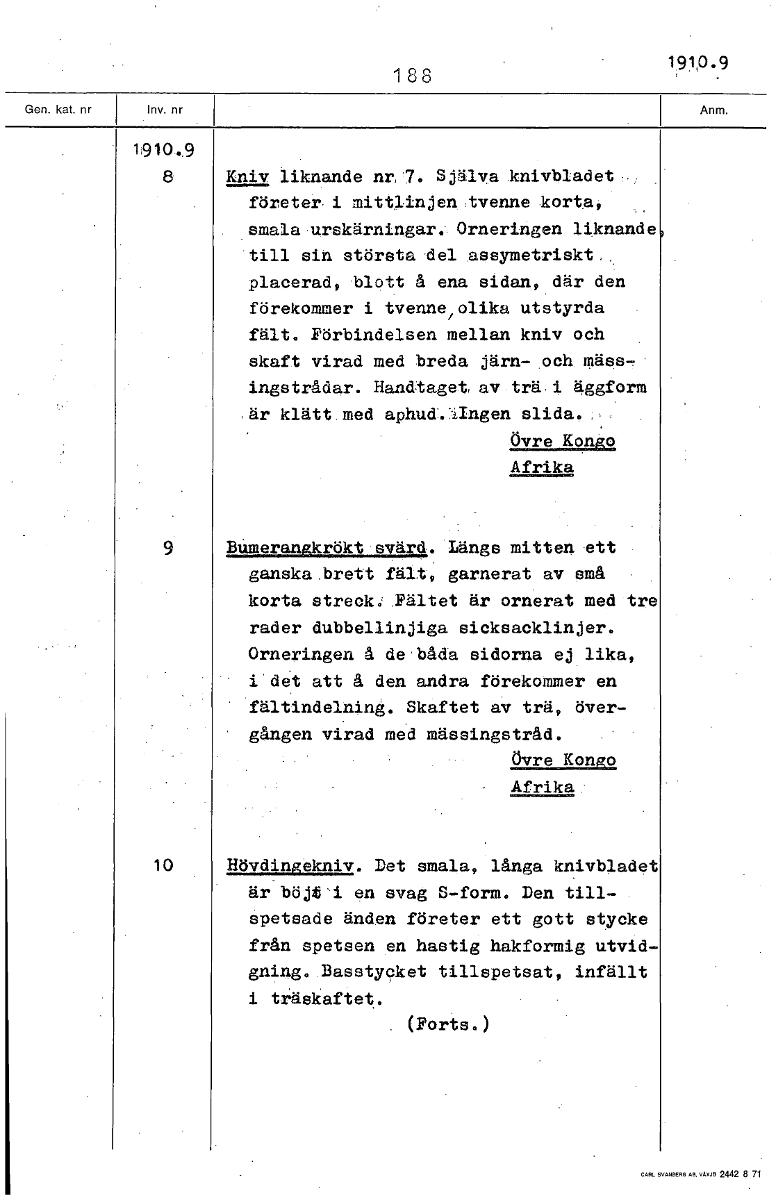 191,0.9 183 1910.9 8 Kniv liknande nr, 7. Själva knivbladet företer i mittlinjen tvenne korta, smala urskärningar. Orneringen liknande till sin största del assymetriskt placerad, blott å ena sidan, där den förekommer i tvenne/olika utstyrda fält. Förbindelsen mellan kniv och skaft virad med breda järn- och mäss- ingstrådar. Handtaget, av trä i äggform är klätt med aphud.angen slida. Övre Kongo Afrika Bumerangkrökt svärd. Längs mitten ett ganska brett fält, garnerat av små korta streck. Fältet är ornerat med tre rader dubbellinjiga sicksacklinjer. Orneringen å de båda sidorna ej lika, i det att å den andra förekommer en fältindelning. Skaftet av trä, över- gången virad med mässingstråd. övre Kongo Afrika 10 Hövdingekniv. Det smala, långa knivbladet är böjt 'i en svag S-form. Den till- spetsade änden företer ett gott stycke från spetsen en hastig hakformig utvid- gning. Basstycket tillspetsat, infällt i träskaftet. (Forts.) [ocr]