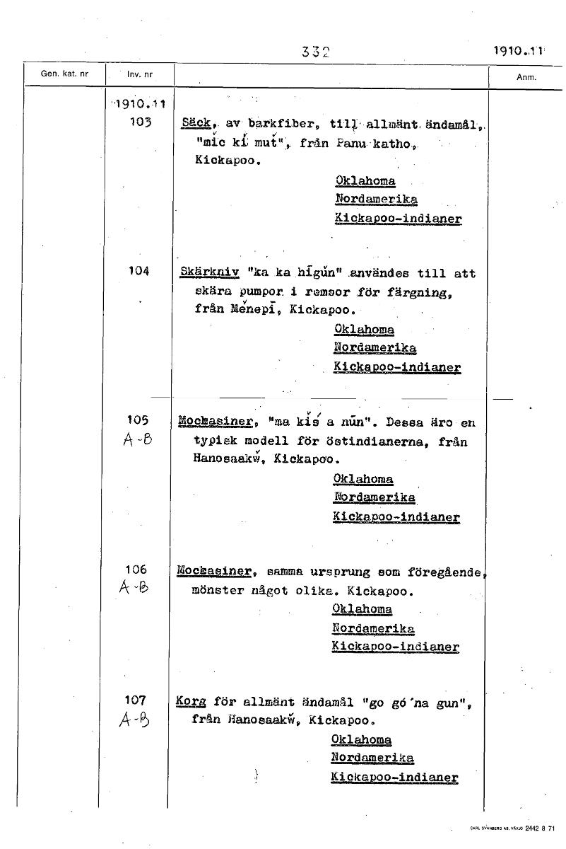 332 1910.11' 19i0.11 103 Säek,, av barkfiber, ti4-allmänt,ändamåle "mie kf från Pahu-kathov. Kickapoo. Oklahoma Nordamerika Kickapoo-indianer 104 Skärkniv "ka.ka higa" "användes till att skära pumpor i remsor. för färgning, från lbinepl, Kickapoo. Oklahoma Nordamerika Kickapoo-indianer 105 Mochasiner, "ma kij a din". Dessa äro en A--8 typisk modell för östindianerna, från Hanosaagi, Kickapoo. Oklahoma Nordamerika. Kickapoo-indianer 106 Mockasiner, samma ursprung som föregående A - mönster något olika. Kickapoo. Oklahoma Nordamerika Kickapoo-indianer 107 Korg för allmänt ändamål "go gö'na gun", från Hanosaagi, Kickapoo. Oklahoma Nordamerika Kickapoo-indianer [ocr]