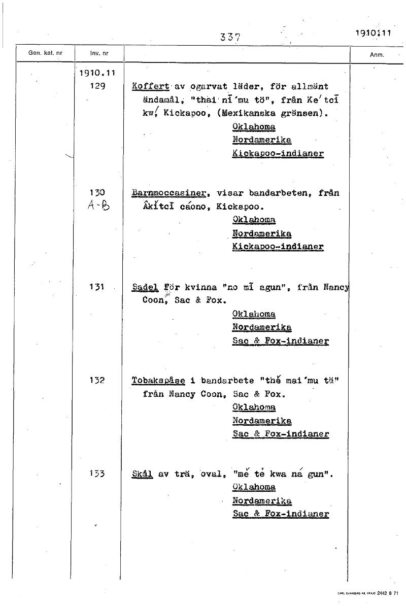 3.3 7 1910.11 1910.11129 Koffert av ogarvat läder, för allmänt ändamål, "thai nI'mu tö", från Ke/tei kw( Kickapoo, (Mexikanska gränsen). Oklahoma Nordamerika Kickapoo-indianer 130 Barnmoccasiner visar bandarbeten, från A - dtci cåono, Kickapoo. Oklahoma Nordamerika Kickapoo-indianer 131 Sadel för kvinna "no ml agun", frän Nanc Coon, Sac & Pox. Oklahoma Nordamerika Sac& Fox-indianer 132 Tobakspåse i bandarbete "ta mat 'mu td" frän Nancy Coon, Sac & Fox. Oklahoma Nordamerika Sac & Fox-indianer 133 Skål av trä, oval, te kwa gun". Oklahoma Nordamerika Sac & Fox-indianer [ocr]