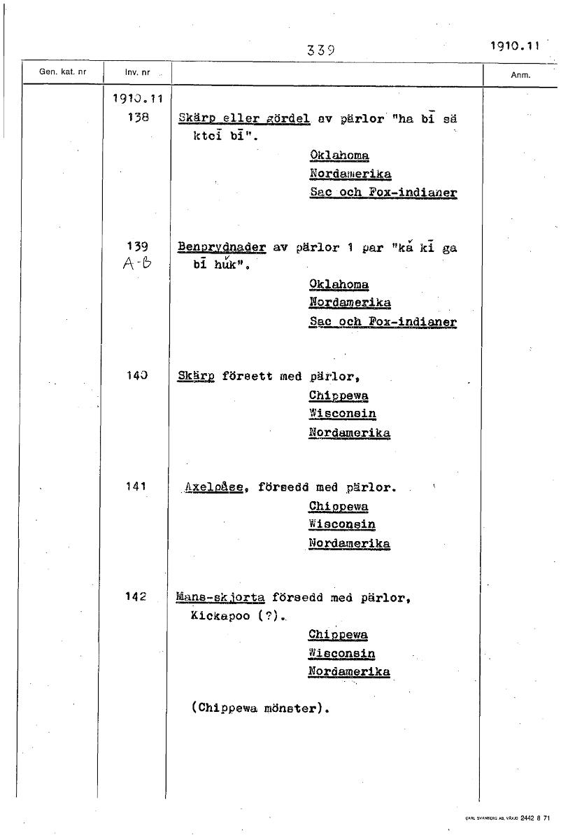 • 339 1910.11 1913.11 138 Skärp eller gördel ev pärlor "ha bi sä ktei bi". Oklahoma Nordamerika Sac och Pox-indianer 139 ikturcoder av pärlor 1 par "kÅ kl ga A -b bi hk", Oklahoma Nordamerika Sac och Fo... Visa hela