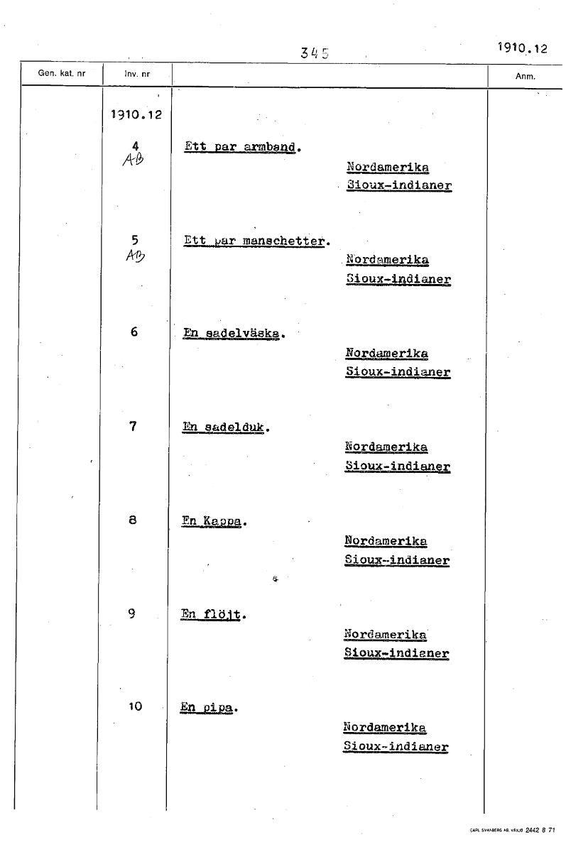 • 3 1910.12 1910.12 4 Ett par armband. Nordamerika Sioux-indianer 5 Ett par manschetter. .NOrdamerika Sioux-indianer 6 En sadelväska. Nordamerika Sioux-indianer 7 En sadelduk. Nordamerika Sioux-indianer... Visa hela