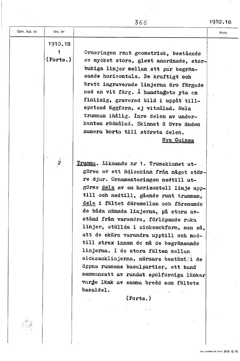366 19to.18 1910.18 1 Orneringen rent geometrisk, bestående (sorts.) av mycket stora, glest anordnade, stor- bukiga linjer, mellan ett par begrän- sande horisontala. De kraftigt och brett ingraverade linjerna äro färgade med en vit färg. Å handta yta en finlinig, graverad bild i uppåt till- spetsad äggform, ej vitmålad. Hela trumman ihålig. Inre delen av under- kanten rödmålad. Skinnet å övre änden numera borta till största delen. Nya Guinea 2 Trumma. Liknande nr 1. Trumskinnet ut- göres av ett ödleskinn från något stör- re djur. Ornamenteringen nedtill ut- göres dels av en horisontell linje upp- till och nedtill, gående runt trumman, dels i fältet däremellan och förenande de båda nämnda linjerna, på stora av- stånd från varandra, förlöpande raka linjer, ställda i sicksackform, men så, att de skära varandra upptill och ned- till strax innan de nå de begränsande linjerna. I de stora fälten mellan_ sicksacklinjerna, närmare bestämtA de öppna rummens basalpartier, ett band sammansatt av rundat spolformiga länkar varje länk av samma bredd som fältets basaldel. (Ports.) [ocr]