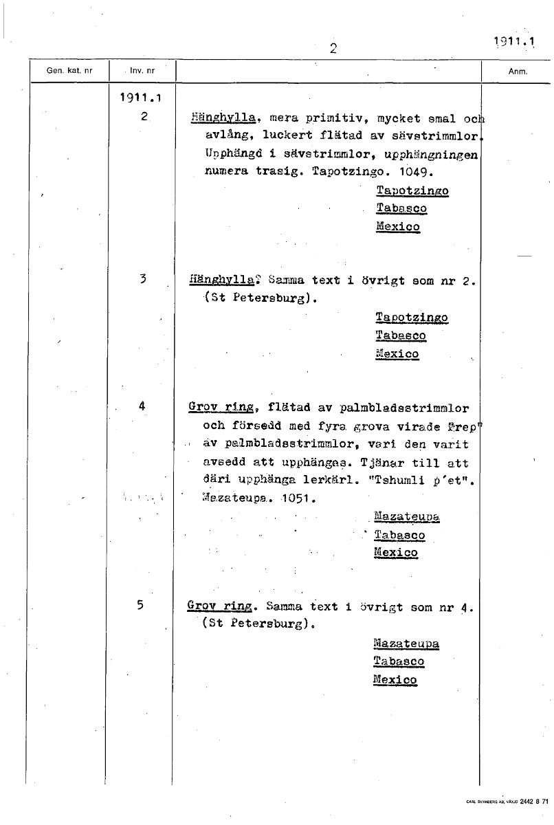 1911.1 ninalaula, mera primitiv, mycket smal ocl avlång, luckert flätad av sävstrimmlor Upphängd i sävstrimmlor, upphängningen numera trasig. Tapotzingo. 1049. Tapotzingo Tabasco Mexico 3 Hänghylls:: Samma text i övrigt som nr 2. (St Petersburg). Tapotzingo Tabasco Mexico 4 Grov ring, flätad av palmbladsstrimmlor och försedd med fyra grova virade 2rep av palmbladestrimmlor, vari den varit avsedd att upphängea. Tjänar till att däri upphänga lerkärl. "Tshumli p'et". Mazateupa. 1051. Mazateupa Tabasco Mexico 5 Grov ring. Samma text i övrigt som nr 4. (St Petersburg). Mazateupa Tabasco, Mexico [ocr]