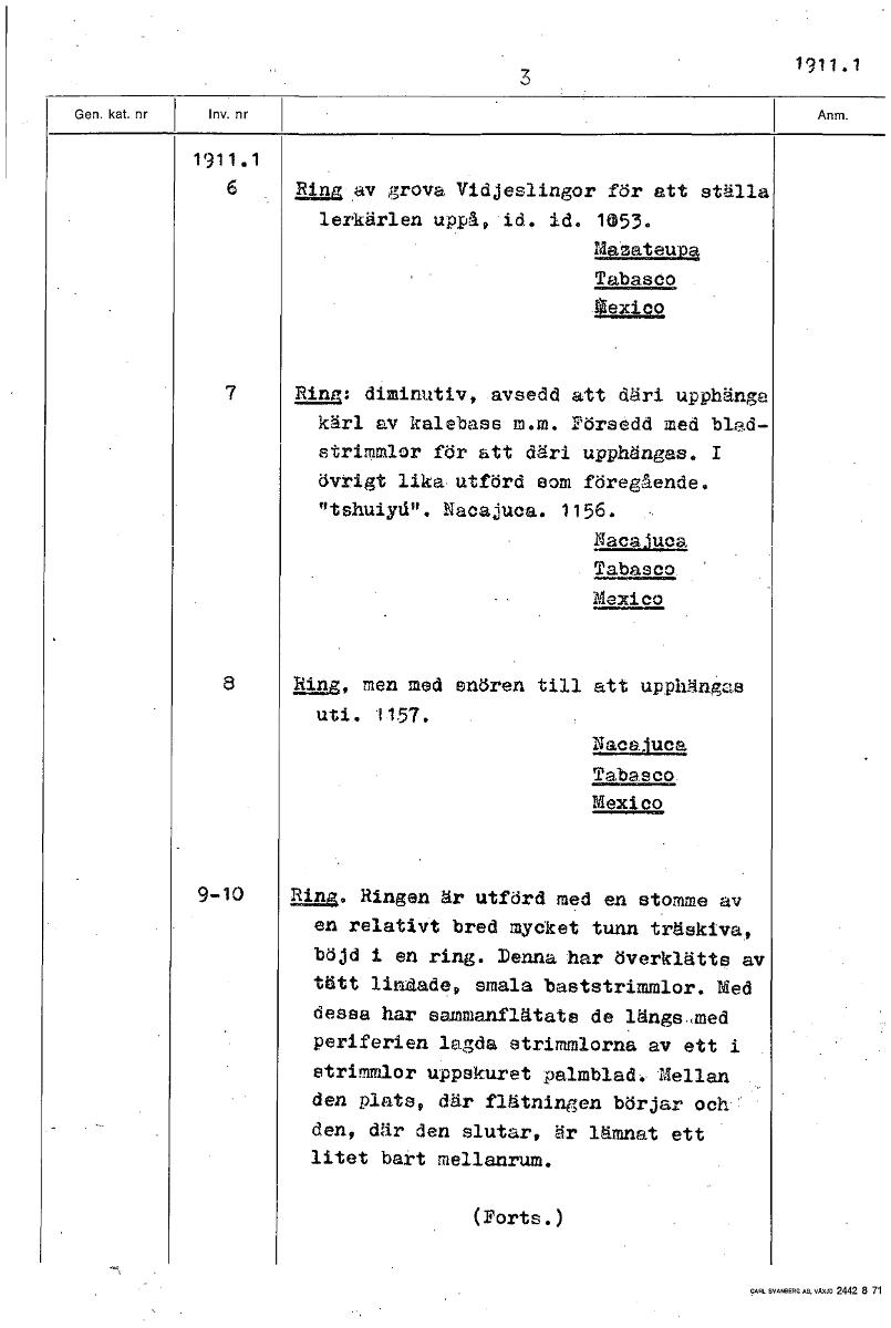 nue av grova Vidjeslingor för att ställa lerkärlen uppå, id. id. 1053. Mazateupa Tabasco gexico 7 Ring: diminutiv, avsedd att däri upphänga kärl av kalebass m.m. Pörsedd med blad- strimlor för att däri upphängas. 1 övrigt lika utförd som föregående. ntshuiyd". Nacajuca. 1156. Nacajuca Tabasco Mexico 8 Ring, men med snören till att upphängas uti. 1157. pacaluca Tabasco. Mexico 9-10 alm. Ringen är utförd med en stomme av en relativt bred mycket tunn träskiva, böjd i en ring. Denna har överklätts av tätt lindade, smala baststrimmlor. Med dessa har sammanflätats de längsmed periferien lagda strimlorna av ett i strimlor uppskuret palmblad. Mellan den plats, där flätningen börjar och den, där den slutar, är lämnat ett litet bart mellanrum. (Forts.) [ocr]
