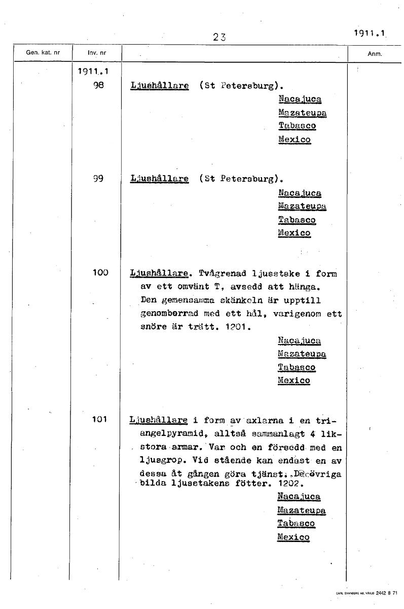 2 3 1911.1 98 Ljushållare (St Petersburg). Nacajuca Mazateues Tabasco Mexico 99 Ljushållare (St Petersburg). Nacaluca Mazateupa Tabasco Mexico 100 Ljushållare. Tvågrenad ljusstake i form av ett omvänt...Visa hela
