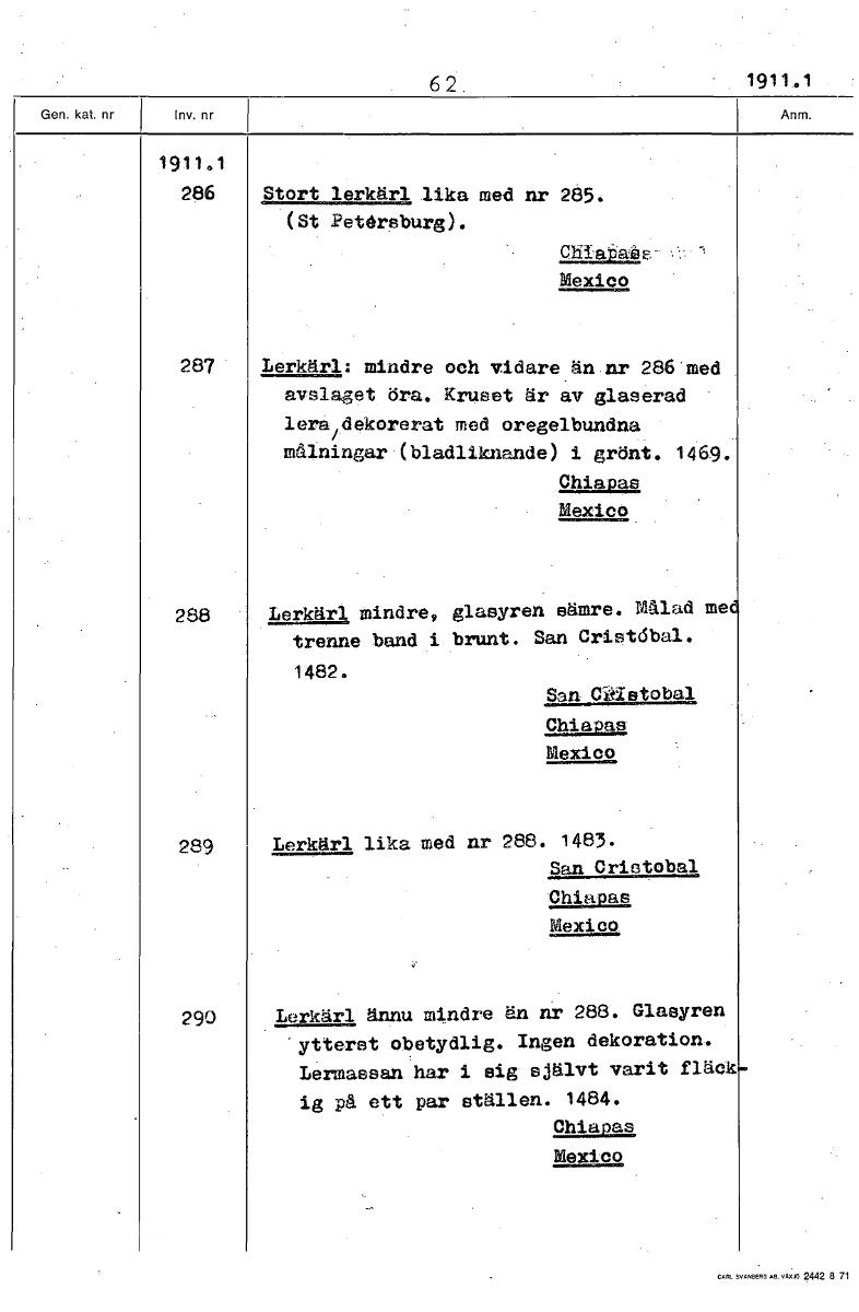62. 1911.1 1911.1 286 Stort lerkärl lika med nr 285. (St Petrårsburg). Mexico 287 Lerkärl: mindre och vidare än nr 286 med avslaget öra. Kruset är av glaserad lera dekorerat med oregelbundna målningar (bladliknande) i grönt. 1469. Chiapas Mexico 288 Lerkärl mindre, glasyren sämre. Målad me trenne band i brunt. San Cristöbal. 1482. San Cidstobal Chiapas Mexico 289 Lerkärl lika med nr 288. 1483. San Crietobal Chiapas Mexico 290 Lerkärl ännu mindre än nr 288. Glasyren ytterst obetydlig. Ingen dekoration. Lermassan har i sig självt varit fläck ig på ett par ställen. 1484. Chiapas Mexico [ocr]Stäng