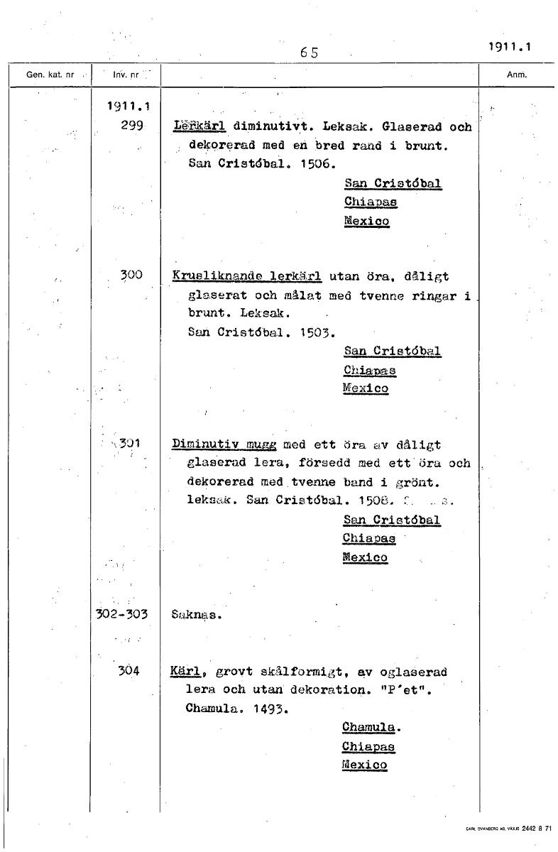 • 65 1911.1 1911.1 299 L'etikärl diminutivt. Leksak. Glaserad och dekorerad med en bred rand i brunt. San Crist6bal. 1506. San Crist6bal Chiapas Mexico 300 Krusliknande lerkärl utan dra, dåligt glaserat... Visa hela