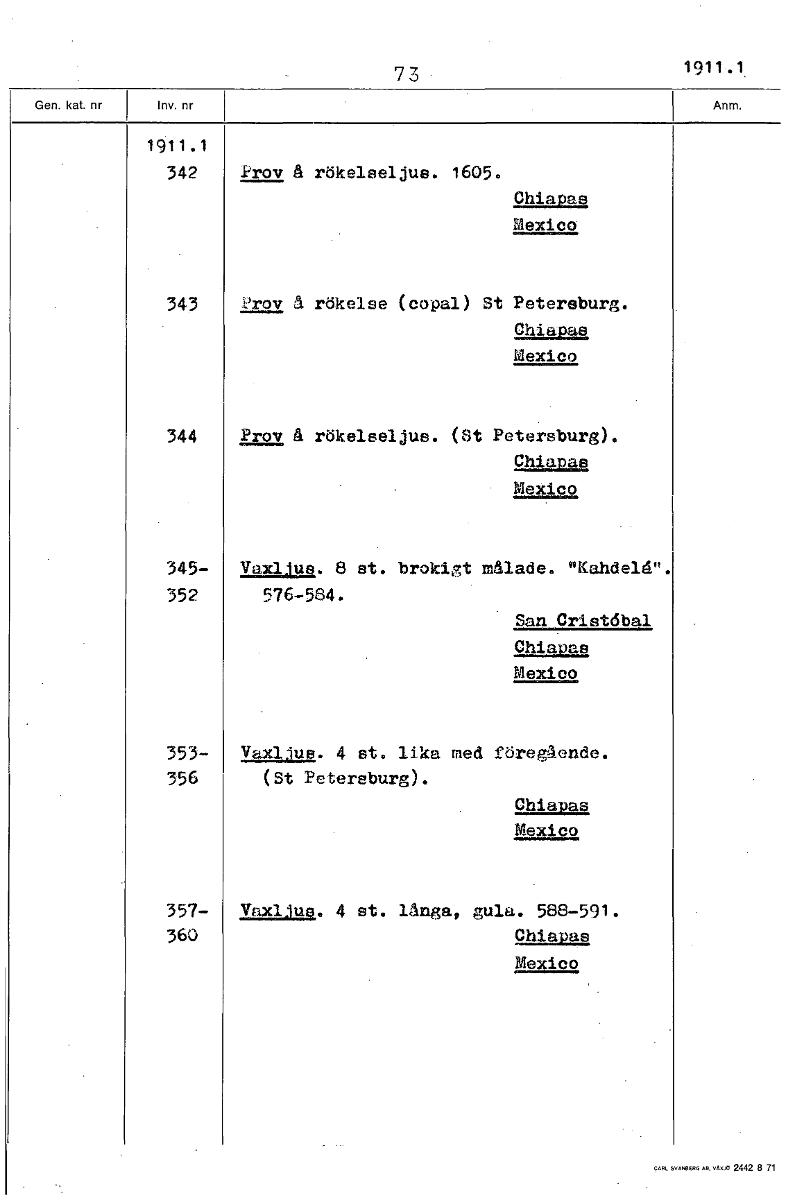 • 73 1911.1 342 Prov å rökelseljus. 1605. Chiapas Mexico 343 1>rov å rökelse (copal) St Petersburg. Chi apas Mexico 344 Prov å rökelseljus. (St Petersburg). Chiapas Mexico 345- Vax1Jus. 8 st. brokigt må... Visa hela