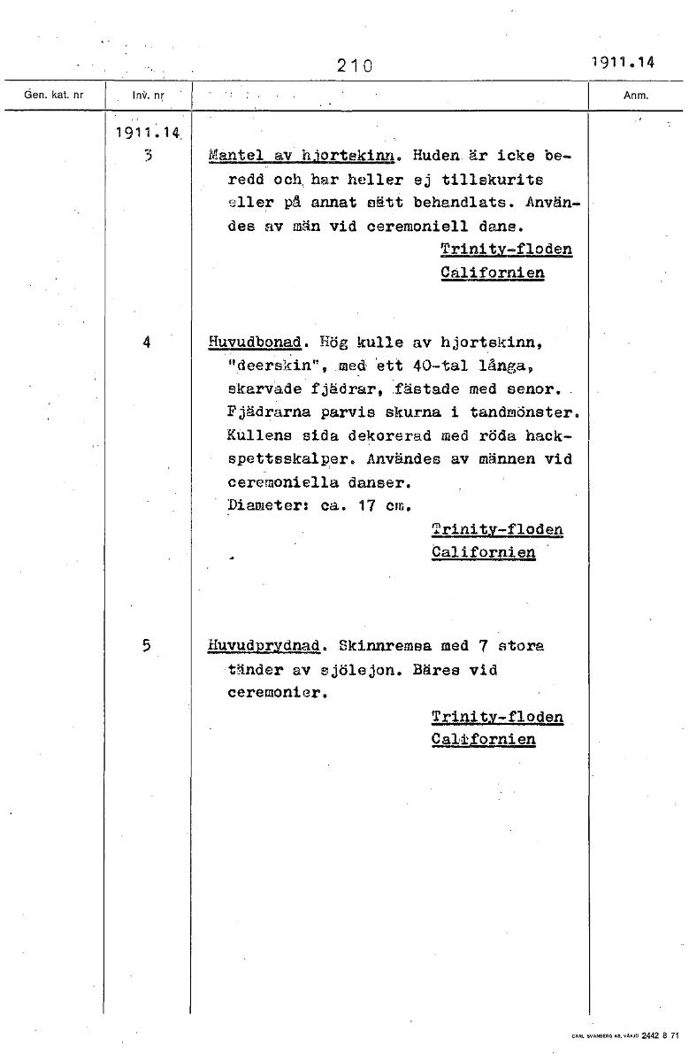 2'10 1911.14 1911.14 3 Mantel av Huden, är icke be- redd ochk har heller ej tillskurits eller på annat sätt behandlats. Använ- des av män vid ceremoniell dans. Trinity-floden Californien 4 Huvudbonad....Visa hela