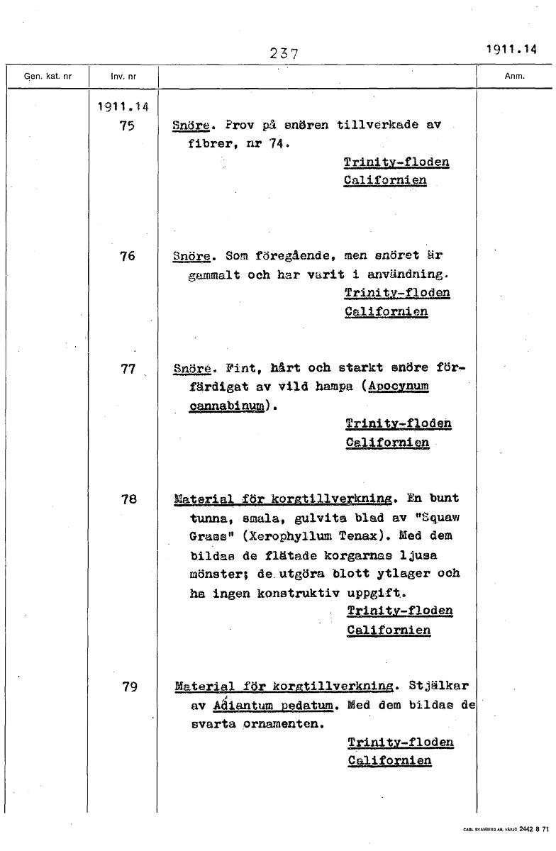 237 1911.14 1911.14 75 Snöre. Prov på snören tillverkade av fibrer, nr 74. Trinitx-floden Californien 76 Snöre. Som föregående, men snöret är gammalt och har varit i användning. Trinity-fiod on Califo...Visa hela