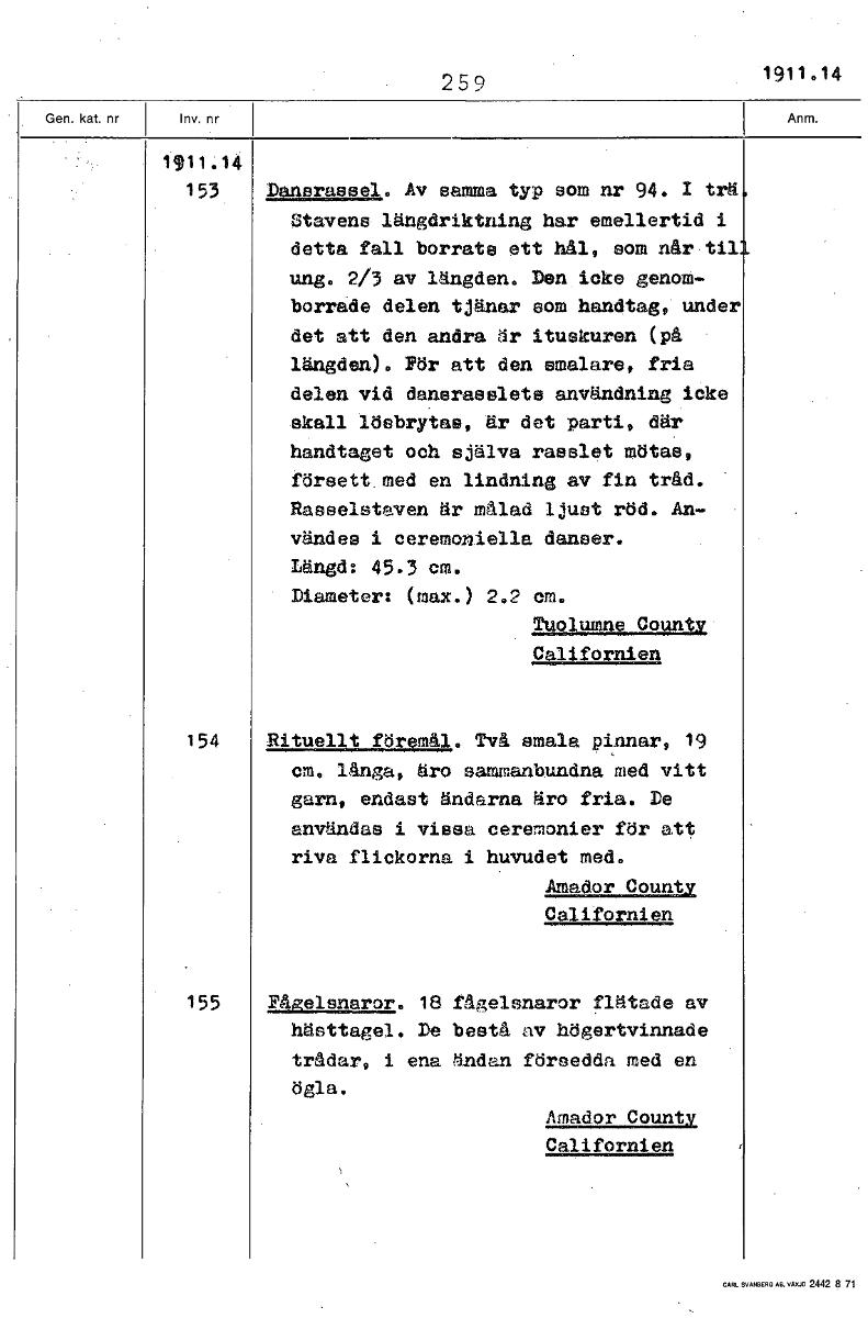 • 259 1911.14 1911.14 153 Dansrassel. Av samma typ som nr 94. I trä Stavens längdriktning har emellertid i detta fall borrats ett hål, som når til ung. 2/3 av längden. Den icke genom- borrade delen tjän... Visa hela