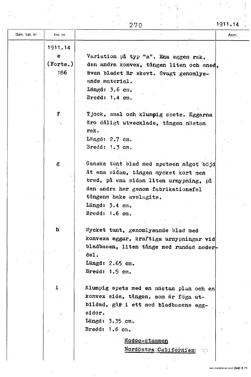 270 1911.14 , 1911.14 e • Variation.på typ "a". Ena eggen rak, (Porte.) den andra konvex, tången liten och ene 186 även bladet är skevt. Svagt genomlys- ande material. Längd: 3.6 era. Bredd: 1.4 cm. f Tjock, smal och klumpig spets. Eggarna äro dåligt utvecklade, tången nästan rak. Längd: 2.7 cm. Bredd: 1.3 cm. g Ganska tunt blad med spetsen något böjd åt ena sidan, tången mycket kort men bred, på ena sidan liten urnypning, på den andra har genom fabrikationsfel tångens hake avslagits. Längd: 3.4 cm: Bredd: 1.6 cm. h Mycket tunt, genomlysande blad med konvexa eggar, kraftiga urnypningar vid bladbasen, liten tånge med rundad neder del. Längd: 2.65 cm. Bredd: 1.5 cm. Klumpig spets med en nästan plan och en konvex sida, tången, som är föga ut- bildad, gåt i ett med bladbasens egg- sidor. Längd: 3.35 cm. Bredd: 1.6 cm. Modoc-stammen Nordöstra:Califårhferr [ocr]