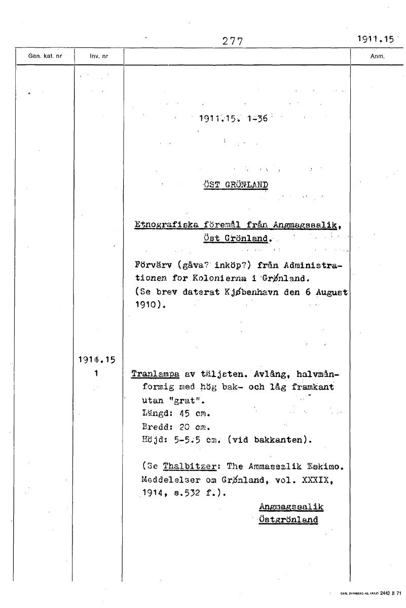 277 1911.15 • 1911...1 . 'ÖST GRÖNLAND Etnografiska föremål från Angmagsealik, Öst Grönland.. ' • ' Förvärv (gåva?*inköp?) från Administra- tionen for Kolonierna i'GrOhland. (Se brev daterat KjObenhav...Visa hela