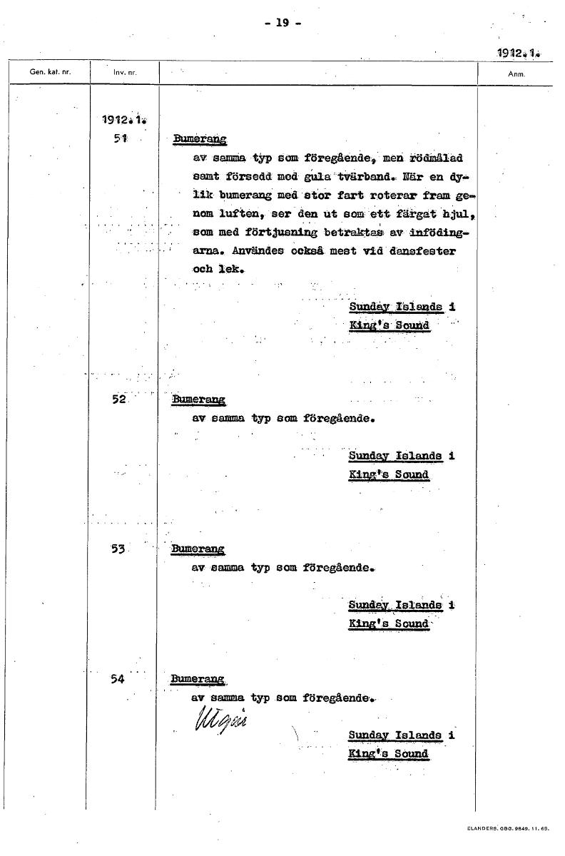 - 19 - 1912,1. 15124.-:47k 51- • Bumerang av samba typ som föregående, men tödianad samt försedd mod gUla'tvärband., När en kr-, lik bumerang med stor fart roterar fram ge- luften, ser den ut som •ett färgat hjul* som med förtjusning betraktas) av inföding. arma. Användes också mest vid dansfester och lek. Sundv Islands i King's Sound 52 Bumerang av samma typ som föregående. Sunday Islands i King% Sound 53 Bumerawk av samma typ som föregående. Sunday. talande i King's Sound 54 Bumerang av samma typ som föregående.- Sunday Islands 1 King's Sound [ocr]