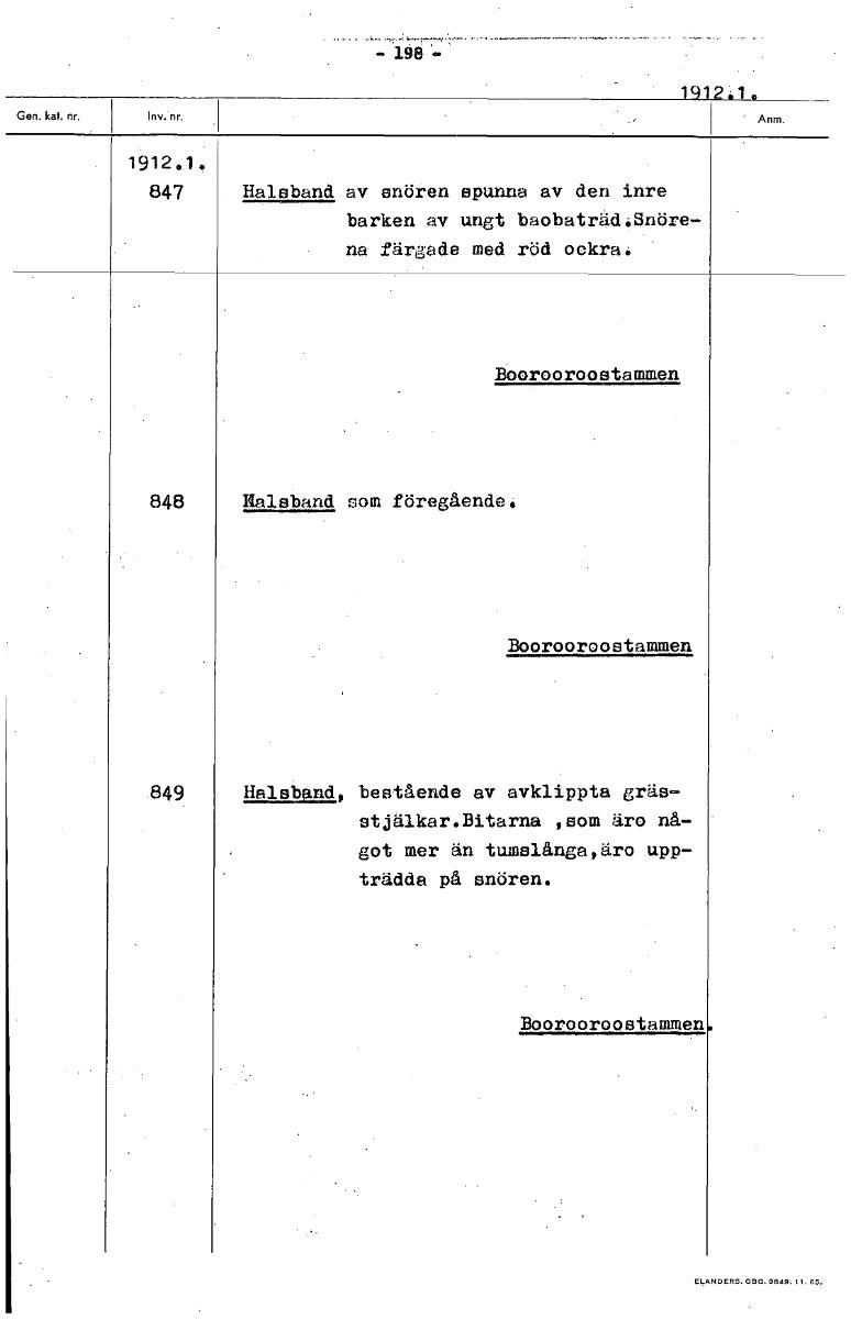 • - 198 1912.1. 1912.1. 847 Halsband av enören spunna av den inre barken av ungt baobaträd.Snöre- na färgade med röd ockra. Boorooroostammen 848 Halsband som föregående. Boorooroostammen 849 Halsband, b... Visa hela