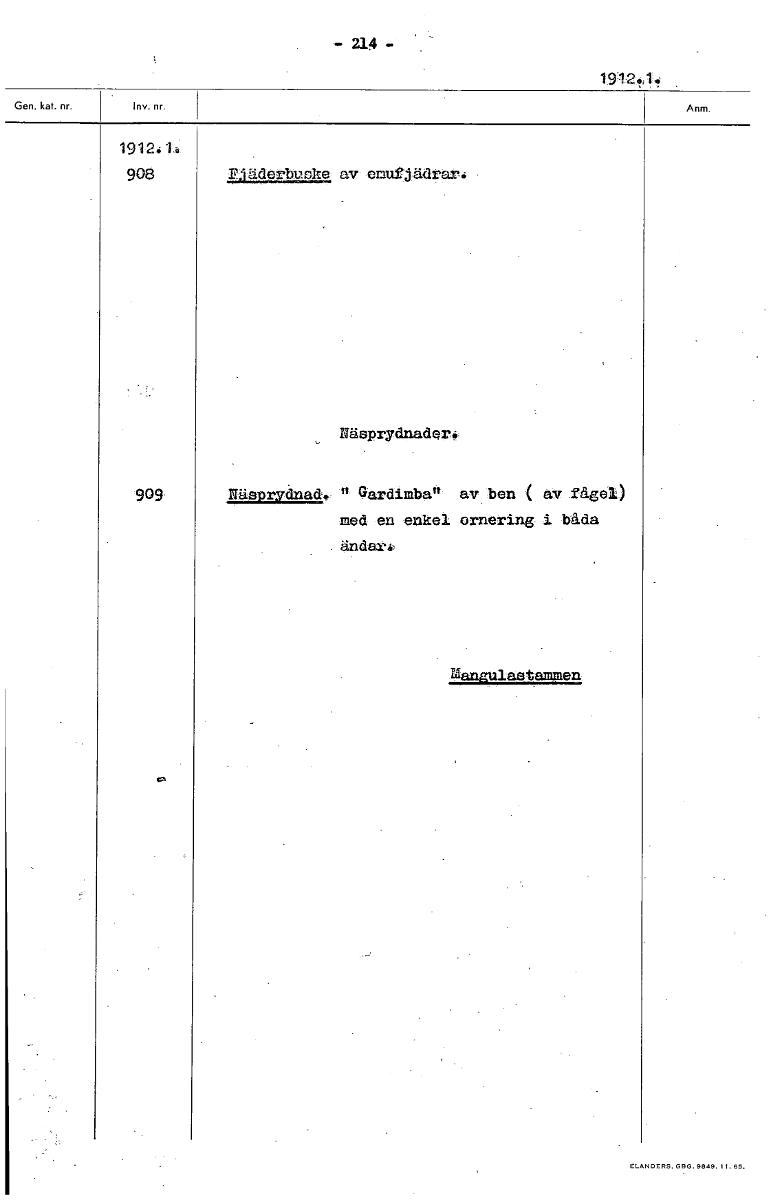 • - 214 - 1912414 19124'1 908 L1142,..: av emufjädrar-: Näpprydnaderk 909 Näsprydnad. Gardimba" av ben ( av fågel) ned en enkel ornering i båda ändar4 Mangulaetammen [ocr]
