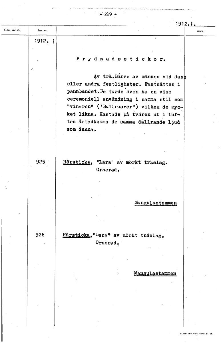 • 219 1912.1 1912. 1 Prydnadssticko r. Av trä.Båres av männen vid dan eller andra festligheter. Fastsättes i pannbandet.De torde även ha en viss ceremoniell användning i samma stil som "vinasen" (°Bullr... Visa hela