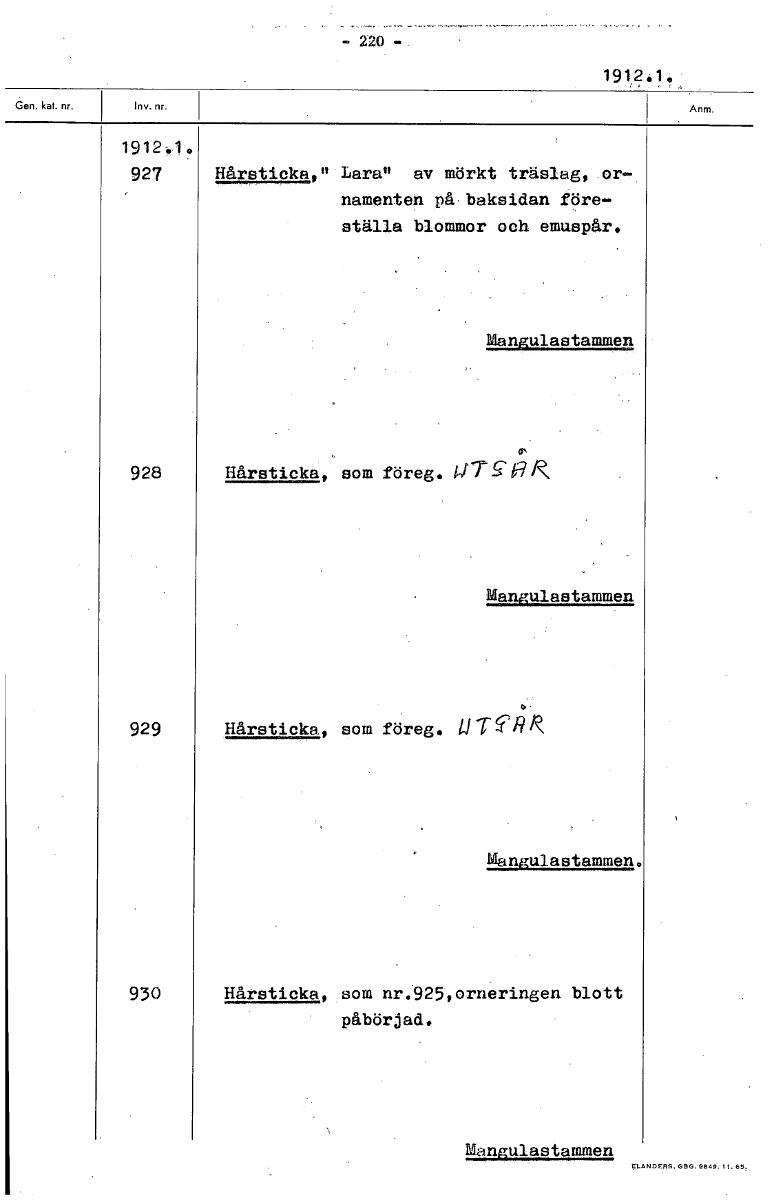 220 1912. i . 1912410 927 Hårstickaon Larau av mörkt träslag, or- namenten på baksidan före- ställa blommor och emuspär. Mangulastammen 928 Hårsticka, som föreg. W7-5:01, Mangulastammen 929 Hårsticka,...