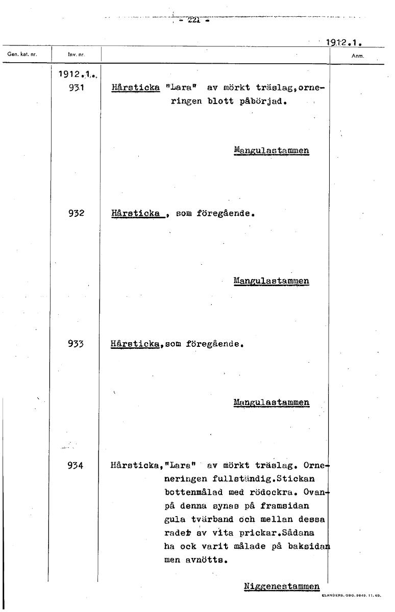 1912.1. 19 1,2 931 Hårsticka "laran av mörkt träslagporne,- ringen blott påbörjad. • Manulastimmen 932 Hårsticka , som föregående. • Manfulastammen 933 Hårsticka, som föregående. Manjulastammen 934 Hårstickatnare av mörkt träslag. Orne neringen fullständig.Stickan bottenmålad med rödockra. Ovan på denna synas på framsidan gula tvärband och mellan dessa rader av , vita prickar.Sådana ha ock varit målade på baksida men avnötts. Niggeneåtammen [ocr]