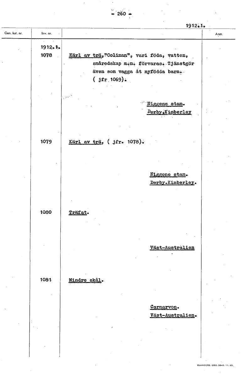 -260 1912..1, 1912,1.. 1078 Kärl av. trä,90olimant% vari föda, vatten, småredskap förvaras... Tjänstgör även som vagga åt nyfödda barn.- ( it'X'.1069)1 :Nine stam. Perb:YErlåtAkä£LIK. 1079 Kärl av trä, jfr. 1078), Niggene stam.. Derby.Kimberley. 1080 Träfat. Väst-Australien 1081, Mindre skål.. Carnarvon. Väst-Australien, [ocr]