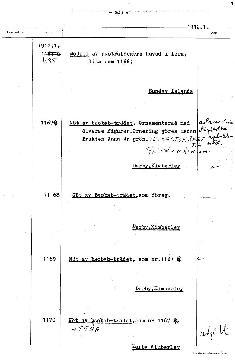 1912:1 Modell av australnegers huvud i lera, lika som 1166: Sunday Islands 1167* Nöt av baobab-trädet. Ornamenterad med diverse figurer.Ornering göres medan _cf3,41_ frukten ännu.är grön. SE;kR/27-,5KFrPi 17- <-7 dov,, r. PlfrUt4 Derby, Kimberley 11 68 Nöt av Baobab-trädet,som föreg. P.WALJUEketkU 1169 Nöt av baobab-trädet, som nr.1167 4 Derby,Kimberley 1170 Nöt av baobab-trädet,som nr 1167 44. a -7- Derby Kimberley ~ [ocr]