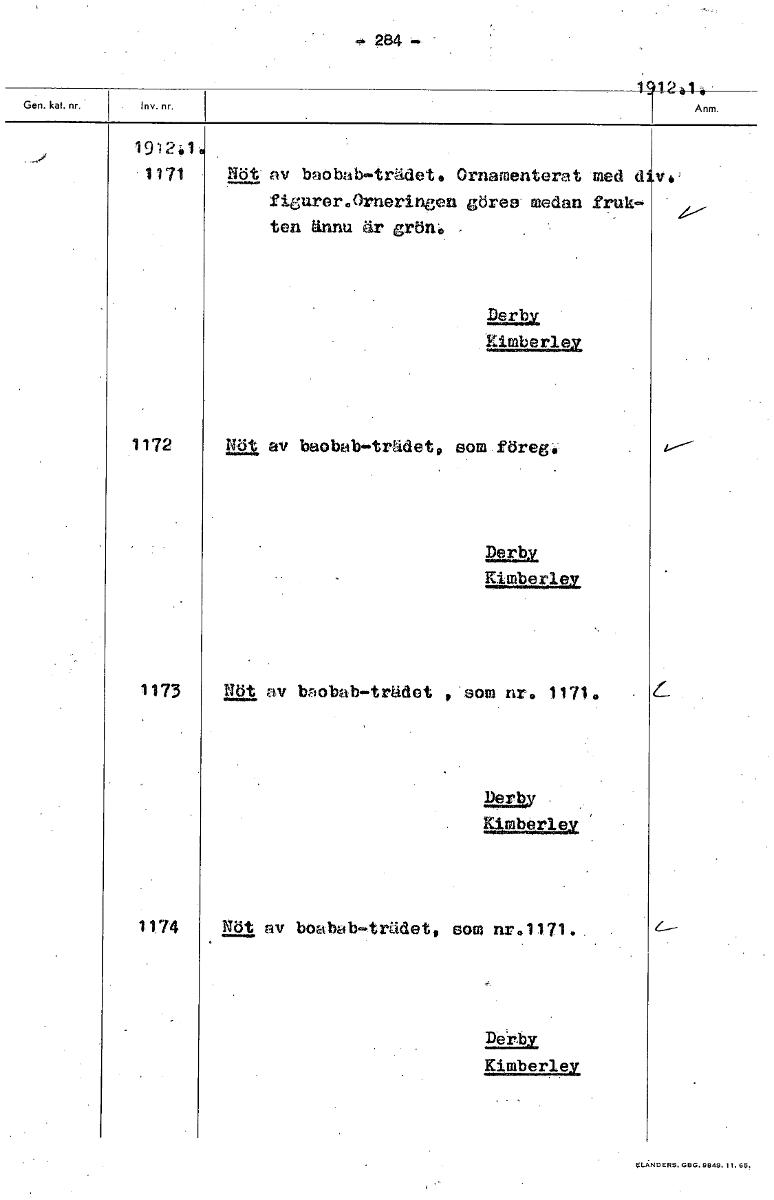 • • 284 1,912 i 1912.1 • 71 Nöt av baobab-trädet. Ornamenterat med d fiurer.Orneringen göres medan fruk- ten ännu är grön. Derby klmberley Ut av baobab-trädet som föreg. 221921 Kimberka 1173 Nöt av baob... Visa hela