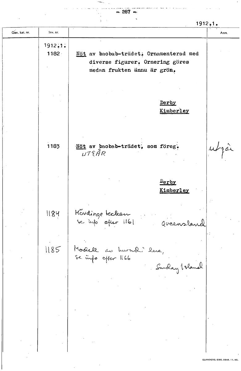 • 9. 287 9. 1912. 1912.1: 1182. Nöt av baobab-trädeti Ornamenterad med diverse figurer. Ornering göres medan frukten ännu är grön. Derby Kimberley 1183 libt av baobab-trädet, som föreg.': Derby Kimberle... Visa hela