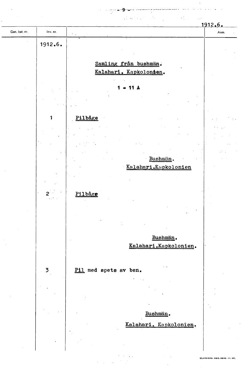 • 1912.6. 1912.6. Samling från bushmän Kalahari. Kapkolondaen. 1 Pilbåge Bushmän. Kalahari.Kapkolonien 2 Pilbåge Bushmän. Kalahari.Kapkolonien. Pil med spets av ben. Bushmän. Kalahari. Kapkolonien. [ocr... Visa hela