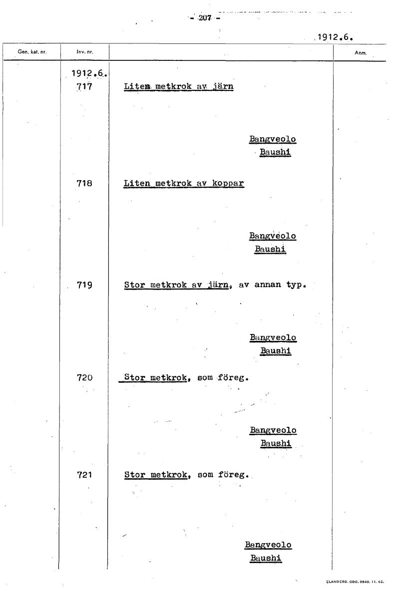 • 207 - 1912.6. 1912.6, 717 Liten metkrok av järn Bangveolo Baushi 718 Liten metkrok av koppar Bangveolo Baushi 719 Stor metkrok av järn, av annan typ. Bangveolo Baushi 720 Stor metkrok, som föreg. Bang... Visa hela