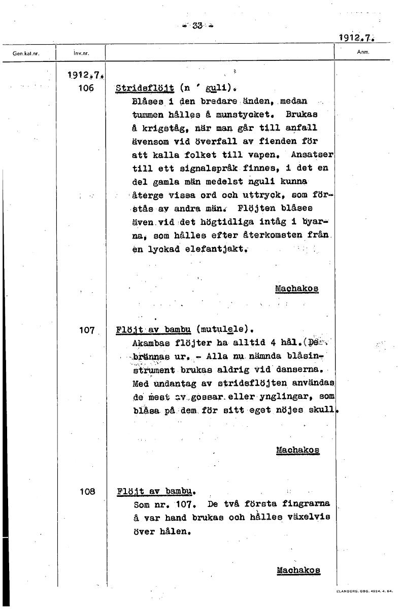 1912.7. 1912.7. 1912.7.105 StrideflöJt (n ' guli). Blåses i den bredare änden, medan tummen hålles å munstyckets Brukas å krigståg, när man går till anfall ävensom vid överfall av fienden för att kall...