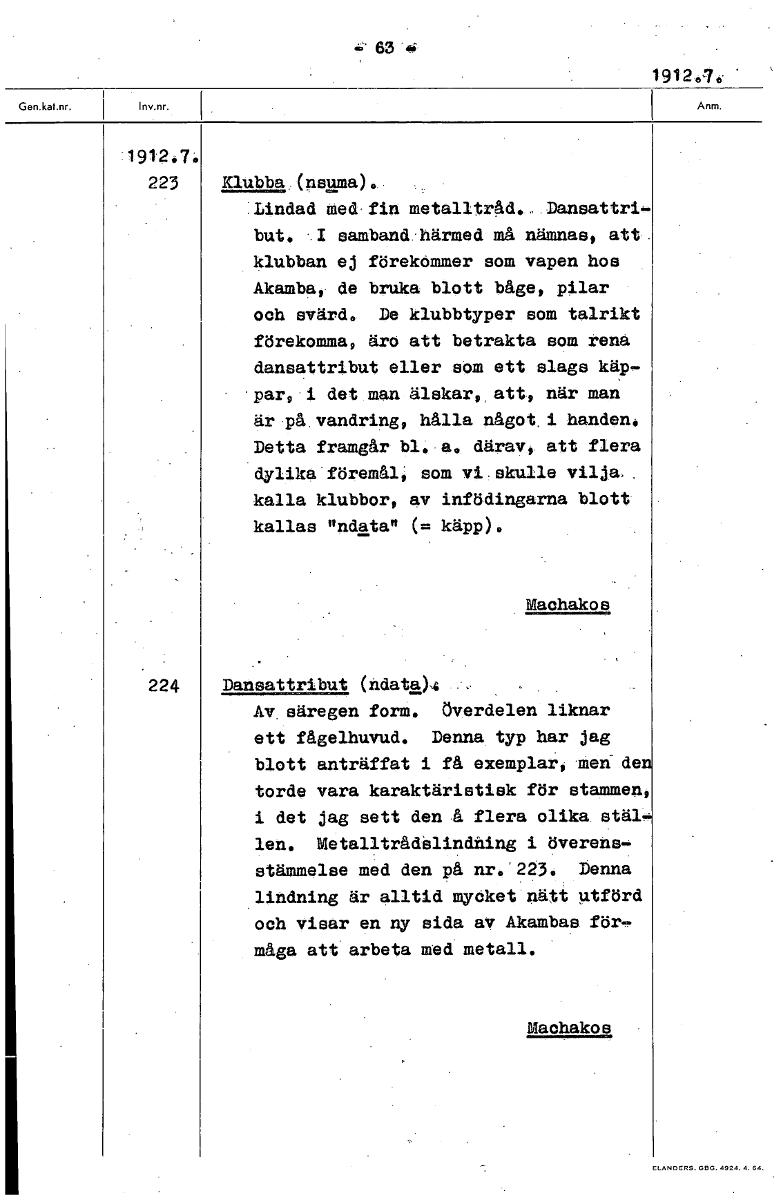 • 63 191207. • 1912.7. 223 Klubba (nsuma). Lindad med fin metalltråd. Dansattri- but, 1 samband härmed må nämnas, att klubban ej förekommer som vapen hos Akamba, de bruka blott båge, pilar och svärd. De... Visa hela