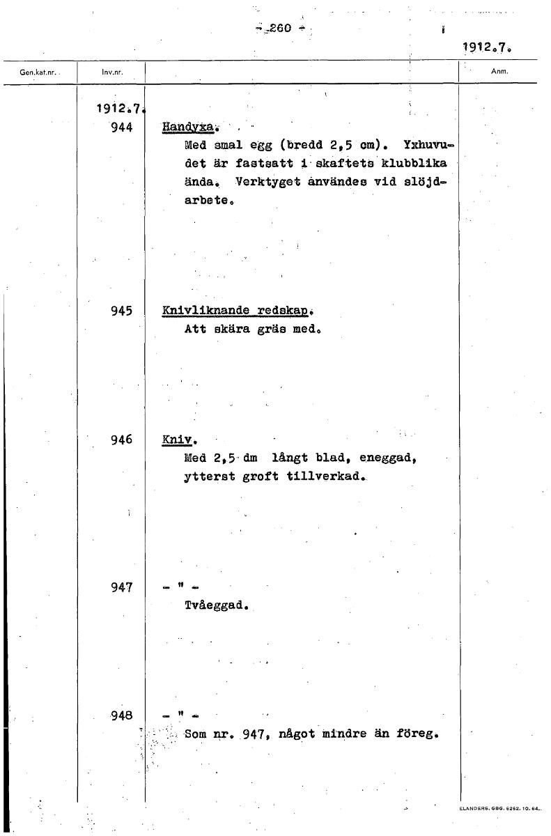 • -;.:2649 1912.7. 1912.7 944 Handyxa Med smal egg (bredd 2,5 om). Uhuvu det är fastsatt 1.skaftets klubblika ända. Verktyget användes vid slöjd- arbete. 945 Knivliknande redskap. Att skära gräs med. 94... Visa hela